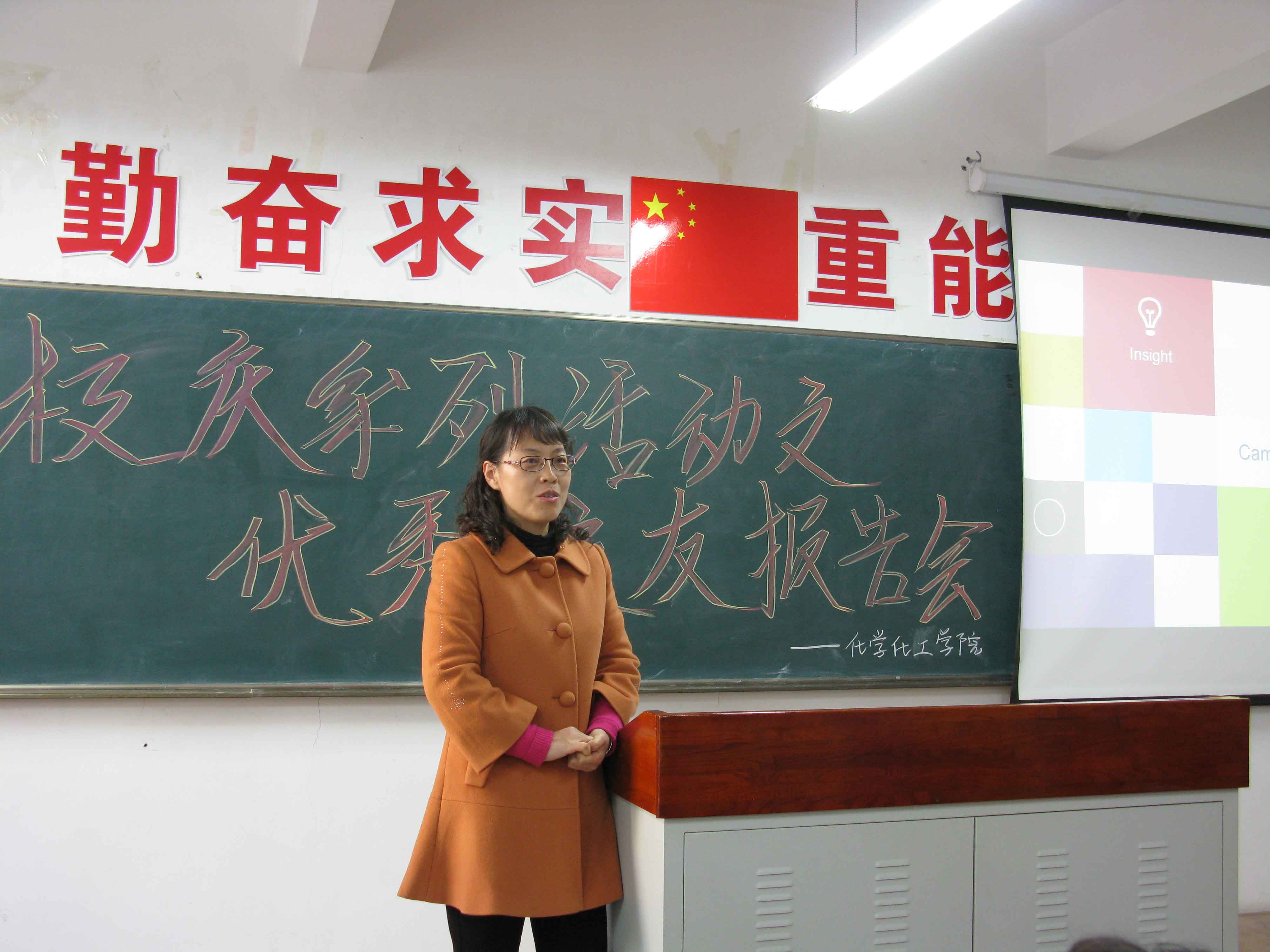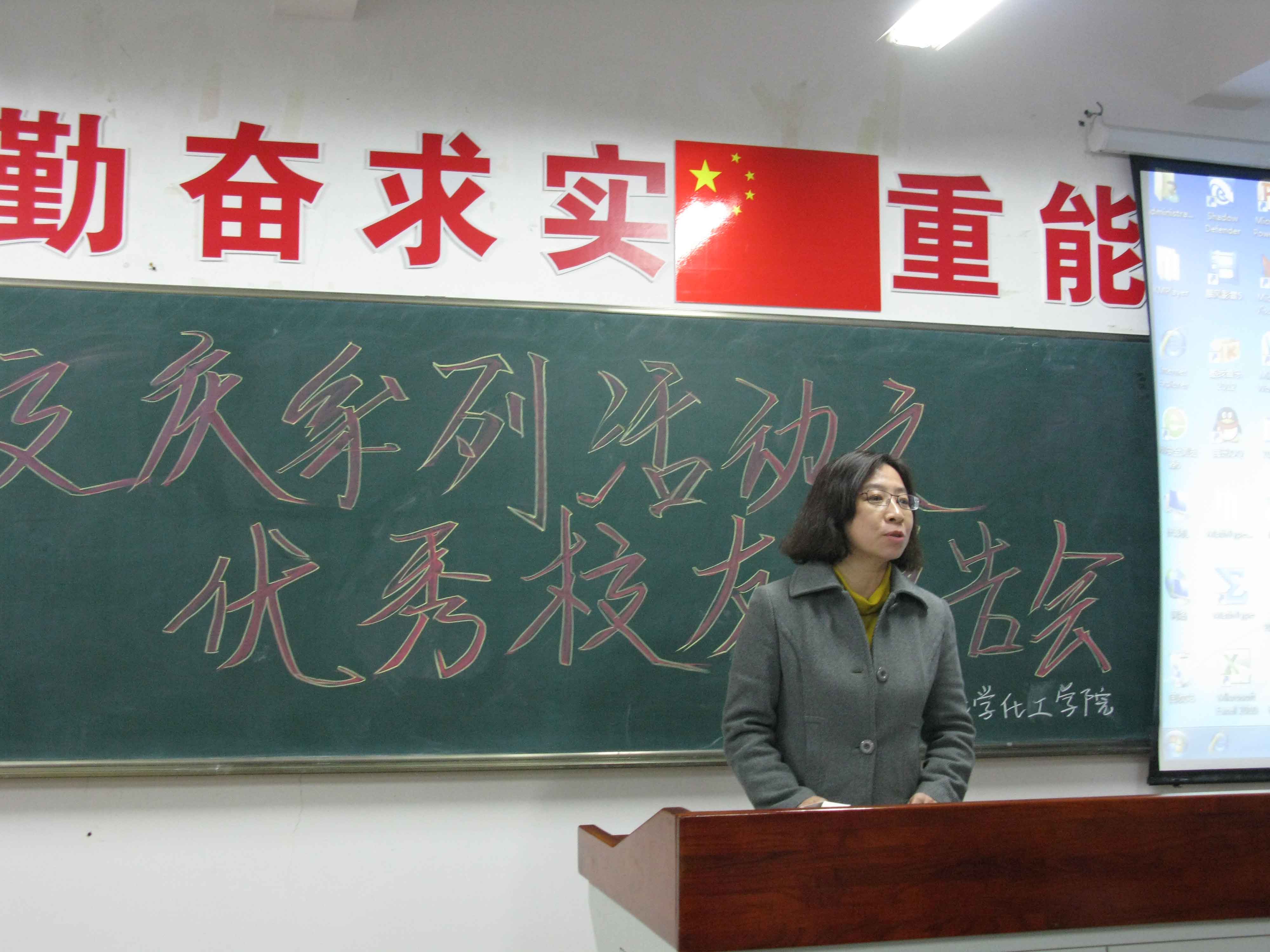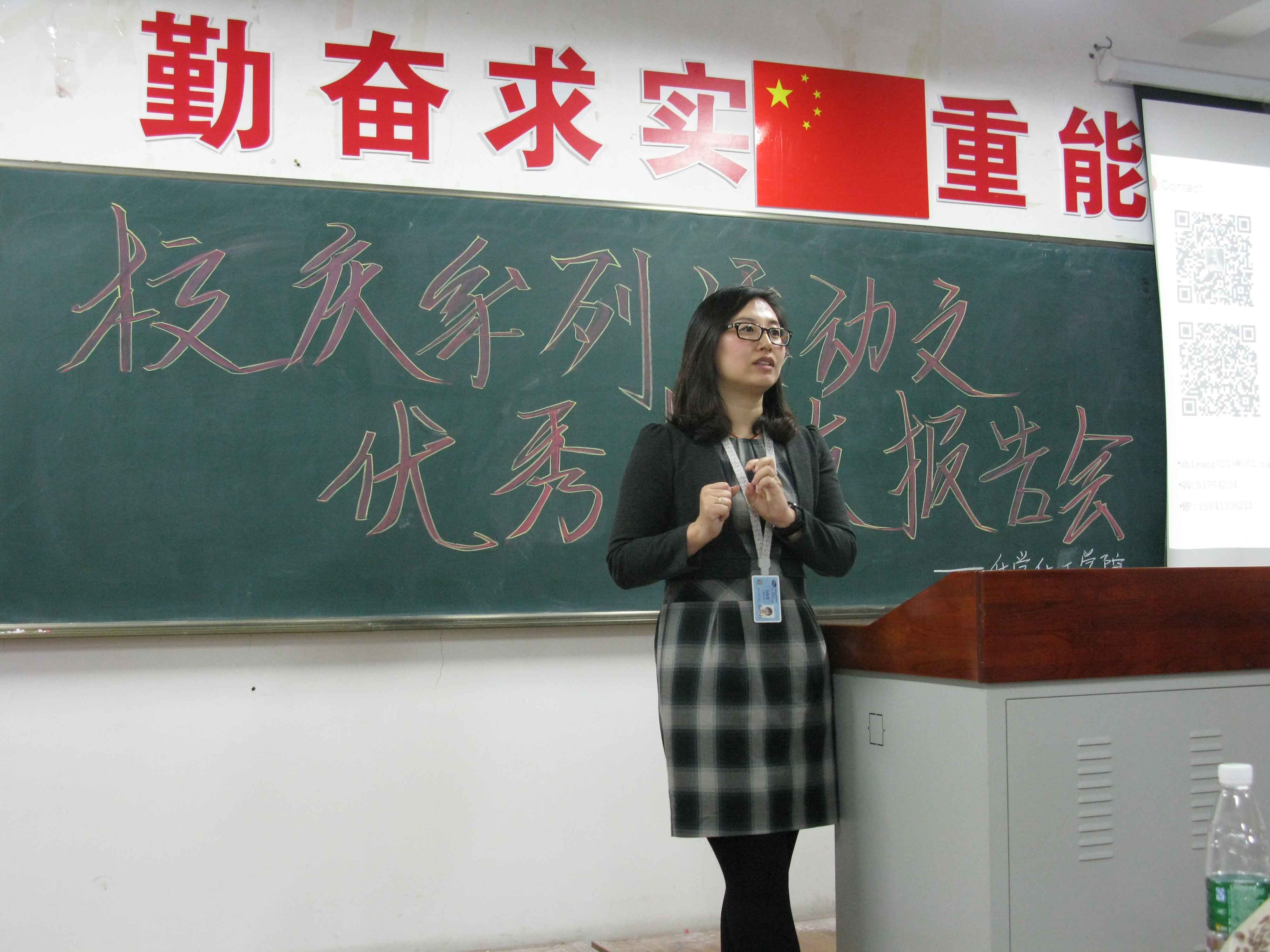 2002级化学专业毕业生施阳和辉瑞制药公司的吕宜男、吕正军。化学化工副院长杨梅老师,党总支副书记李群老师,王秋老师,金晶老师,吕成伟老师出席了本次报告会。2013、2014级本科生和部分研究生参加了本次报告会。