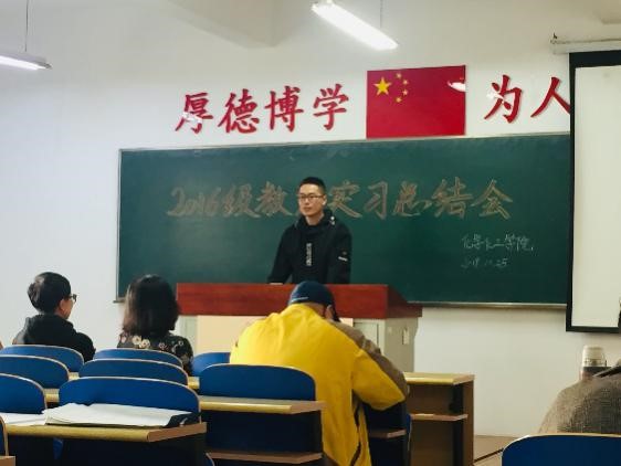 实习生在教育实习工作中的表现,祝贺同学们出色完成各项实习任务。徐老师结合自己的教学工作与六盘水支教经历,饱含深情地分享了自己对“教师的样子”的思考,鼓励同学们树立远大理想,追逐自己的教师梦。徐老师精彩的发言在全体与会师生中引起巨大反响,带给师生深深的感动。