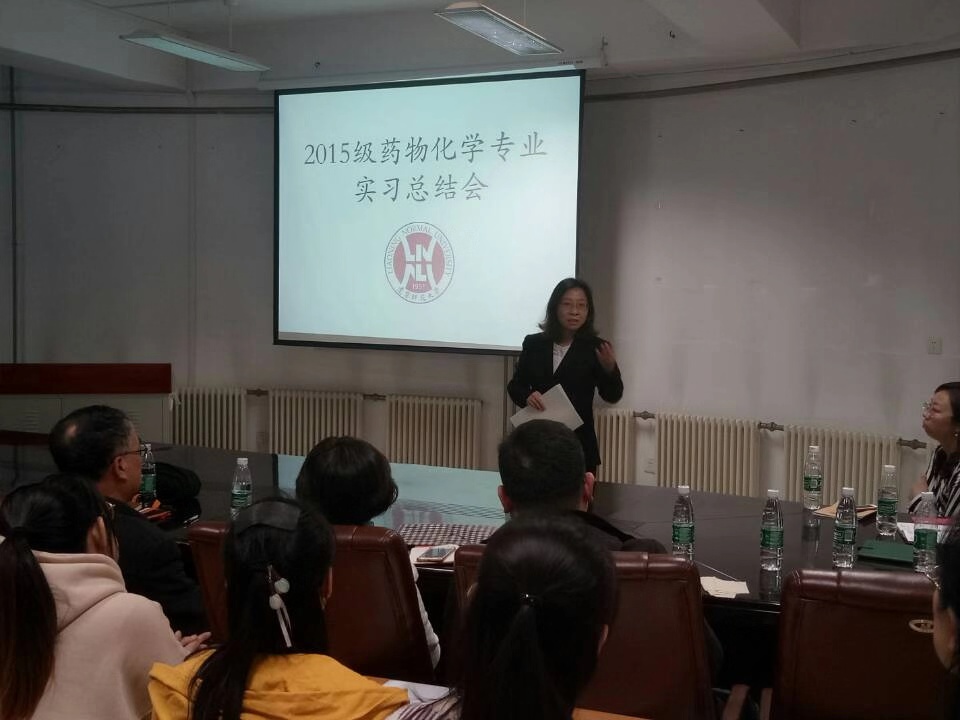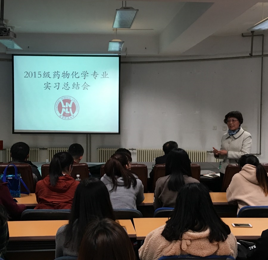 教学院长杨梅教授,邢永恒教授、赫春香教授、翁前峰教授、实习带队教师王澈、李坤老师以及药物化学专业和分析专业全体教师,2016级、2017级药物化学专业全体学生参加了此次总结会。会议由辽宁师范大学李坤老师主持。