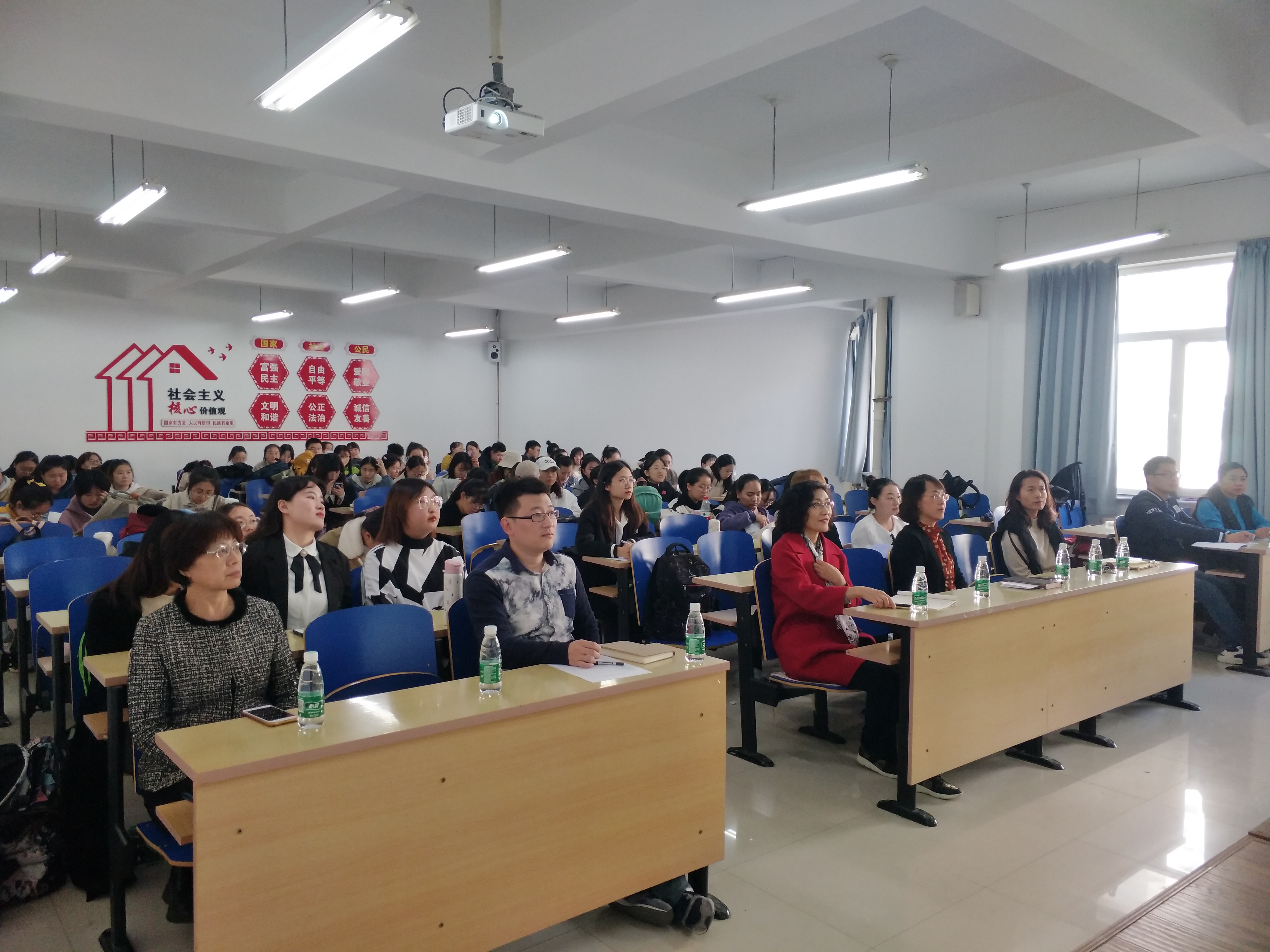 与会领导、老师和实习生认真听会