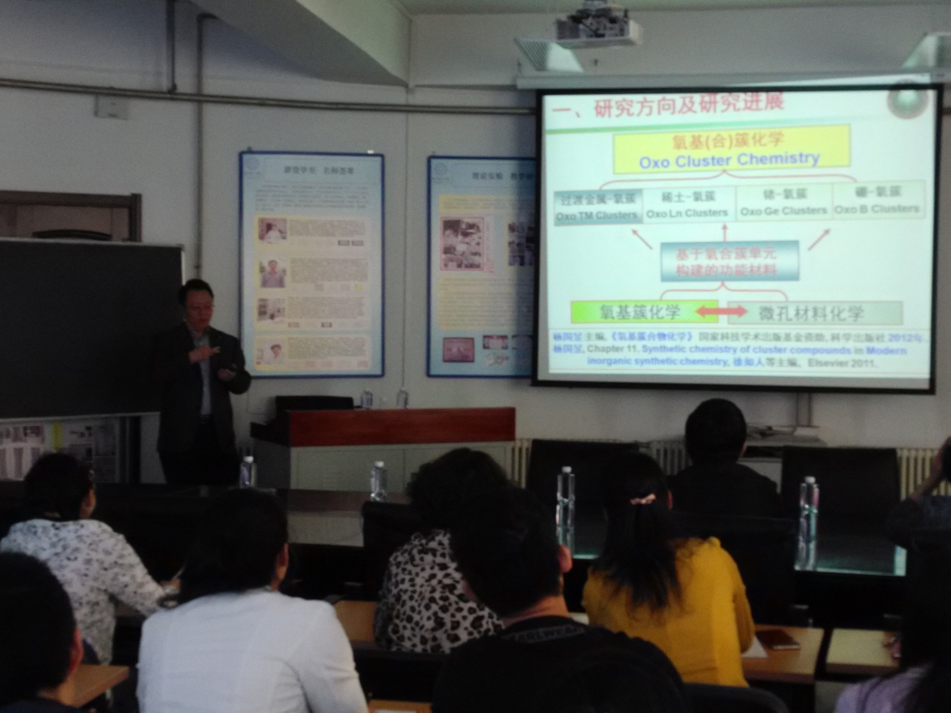 5月15日上午9:00,北京理工大学杨国昱教授受邀在辽宁师范大学理化大楼C区会议室进行了一场题为“簇空旷骨架与簇有机骨架”的学术报告。报告中,杨国昱教授就其多年的研究成果和主要从事的过渡金属-氧簇、主族元素-氧簇、稀土-氧簇等单元构筑的多孔材料及催化材料的研究进行了阐述,并与红桃视频 老师对于该领域的研究前景等问题展开了深入的探讨和交流。此次学术报告受到了红桃视频 师生热烈的欢迎和一致的好评。