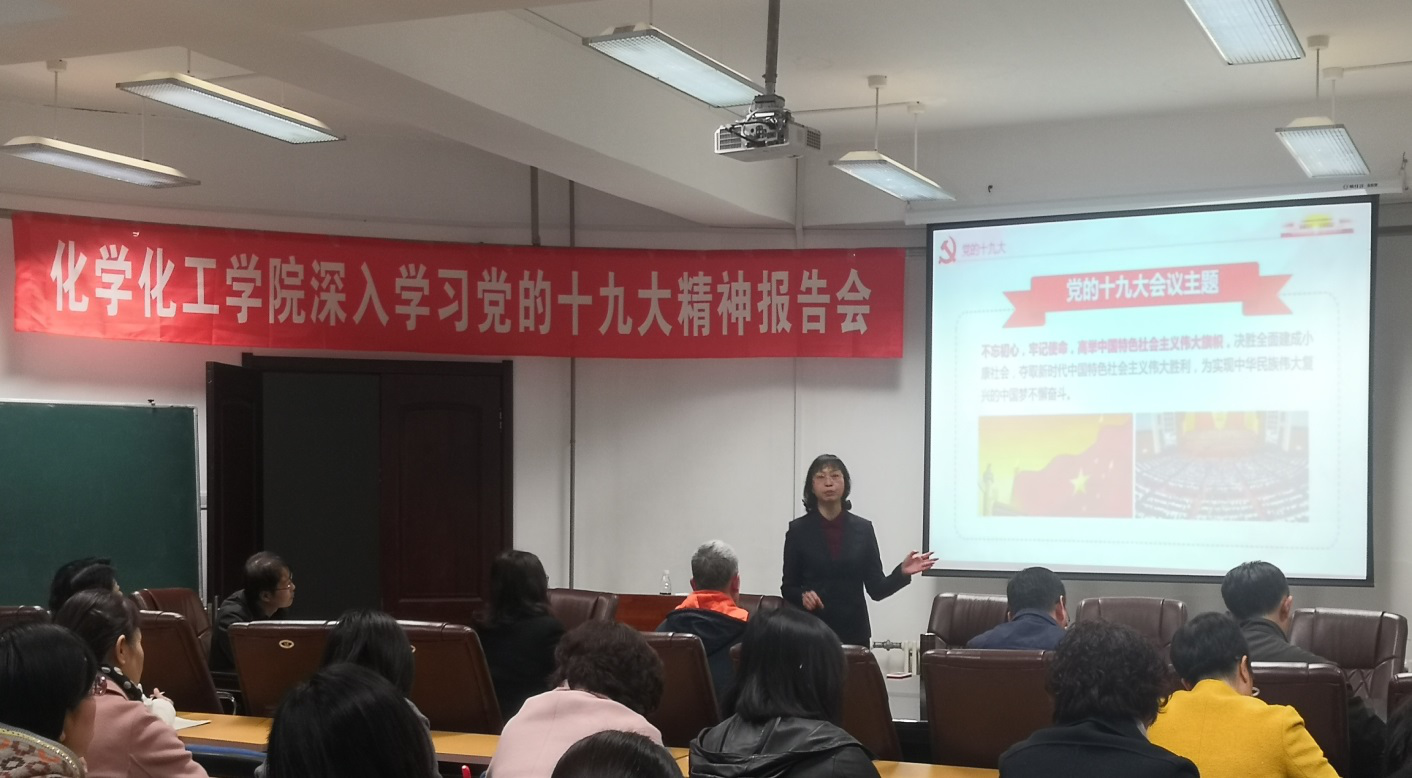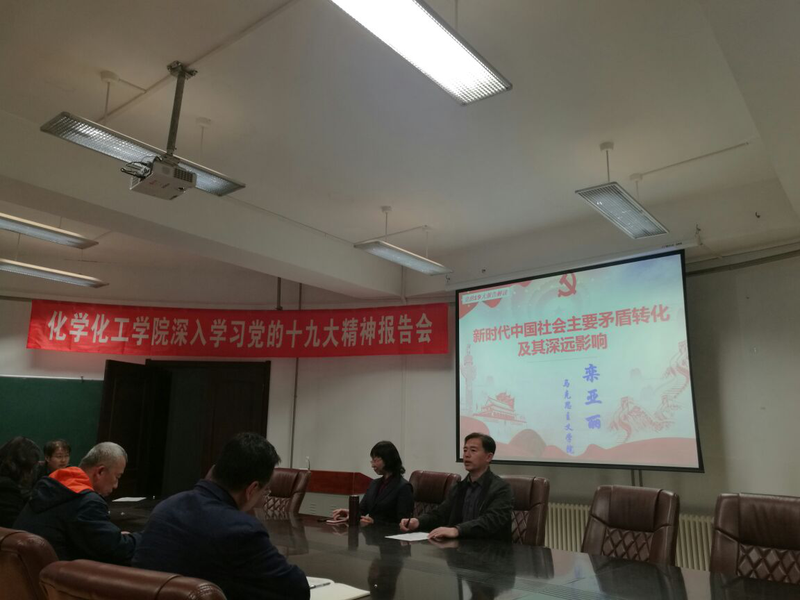 为深入学习宣传贯彻党的十九大精神,2018年4月13日下午,红桃视频 于理化楼C区401会议室举办学习党的十九大精神专题报告会,邀请马克思主义学院副教授栾亚丽为全体教师职工作了一场题为“新时代中国社会主要矛盾转化及其深远影响”的报告。报告会由学院党总支书记刘智广主持。