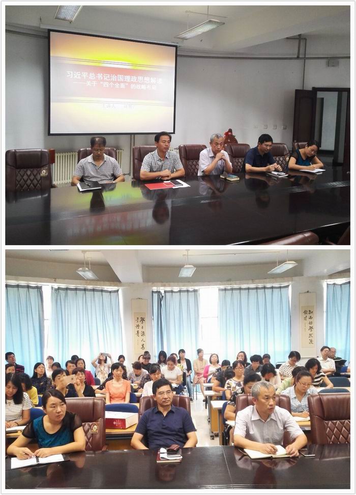 全体教工在四楼会议室认真聆听了题为《习近平总书记治国理政思想解读——关于“四个全面”的战略布局》的讲座,主讲人为红桃视频