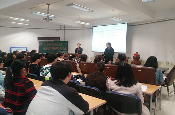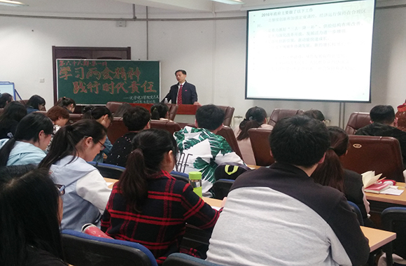 学院党总支书记刘智广老师以“学习两会精神,践行时代责任”为主题展开本期培训的第一讲。首先,刘书记以提问的形式带领大家思考两会召开的意义所在。随后,刘书记结合自身的经历向大家生动地解读了“旧小康与新小康”及“创新、协调、绿色、开放、共享”五大发展理念,并希望大家时刻保持高度的政治敏锐性,善于用政治的眼光分析观察形势、解决问题。最后,刘书记向大家分析了2017年政府工作报告的主要内容、2016年政府所做的八个方面的工作以及2016年经济社会发展所遇到的困难与险阻。刘书记通过具体实例告诉大家,“两会”离我们并不遥远,它关乎我们日常生活的每一个细节,它与我们每一个人都息息相关。